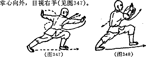 度成左弓步两拳变掌同时向两侧展出掌心向外目视前方(见图346),
