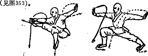接占动作右脚落左脚前成右弓步两手由胸前环弧然后同府向身前、后展仰右手在前左手在后目视右掌接占动作右脚落左脚前成右弓步两手由胸前环弧然后同府向身前、后展仰右手在前左手在后目视右掌(图352) (图的3)〔实用1用法同一路二十七势和49图。(二八二)慧子暇食(图352) (图的3)〔实用1用法同一路二十七势和49图。(二八二)慧子暇食