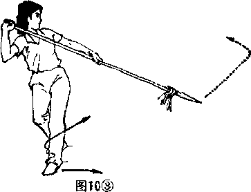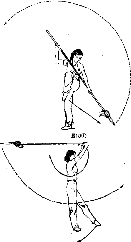 1重心右移右腿直立左腿屈膝提起身体微右转左手滑把于枪身中段,同时往左下方拨枪。目视植尖(图1。1),2上动不停口左腿往左侧落步身体稍左转同时左手松滑附于右手持枪把端处双手持枪上举由前向左向后划半圆(图10)图23紧接上动。右腿屈膝半蹲左腿向右前移脚尖虚点地面成左虚步口同时两手持枪由后向右划平圆再向前、向左下方拨出左手松滑握于枪身中段口目视枪尖(图3)。技击要领土当时方欲扎我左脚时我上提左腿并向下拨开对方扎枪。当对方继续往我头部和脚部扎枪时我迅旗做云拨枪和虚步拨枪口以上动作必须连贯协调做虚步拨枪时枪身须贴紧左腰侧。