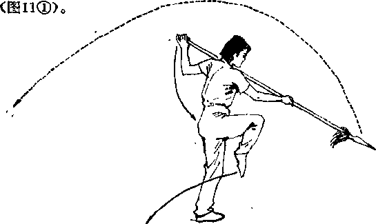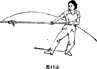 2上动不停。以左脚前掌为轴身体右后转工8(面朝西南),右脚往前落步脚尖朝前双腿稍屈膝半蹲。同时右手使枪尖顺转体之势向下、向后拨出。目视枪尖(图2),