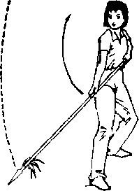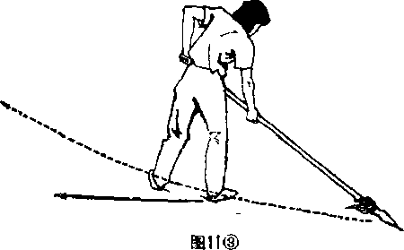 3紧接上动。左脚向前上一步,脚尖里扣身体右后转180,(面朝东北)右手使稔尖随转体之势向右后方拨开。目视稔尖(图1工3)