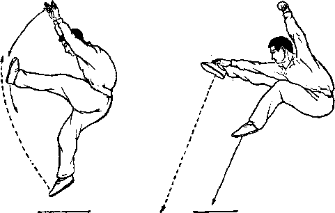 2紧接上动右手掌向前上方直臂摆起在前额上方以左掌迎击右掌背多同时左腿向前上方摆起右脚瞪地跳起身体腾空(图262)。