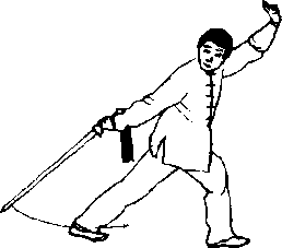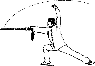 (5)右手握剑向左向上划弧抡剑手心朝前方使剑与地面平行剑尖朝左方左剑指向右肩前划弧手心朝前方剑指