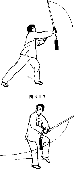 关节伸直剑与臂在一条直线上剑尖朝后卜方上体左转时左剑指扶在右小臂内侧剑后撩时左手伸向体左前上方手心朝前剑指朝后肘关节微屈,目视剑尖方向(图117?图4-119)