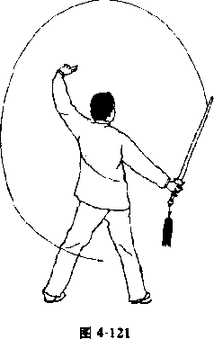 (3)右手握剑屈腕使剑尖朝体前方随上体的翻转划弧挂剑一周使剑尖朝左下方挂剑时手臂与剑成左剑指随上体的翻转经上方向下方划弧至腹前停于右小臂内侧手心朝下剑指指向右方。目视剑尖方向(图4-120?图4-122)