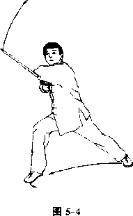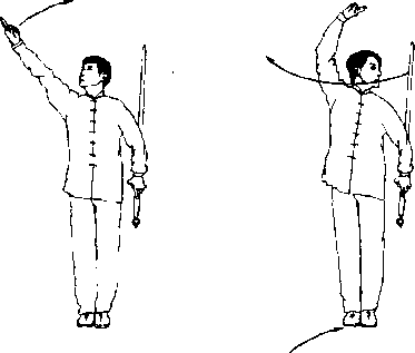 (3)左手持剑仍保持原姿势不变右剑指向头上方划弧,边划小臂边内旋屈肘翻腕使手心朝右上方剑指指向左上方口目视左方,(图5-3)