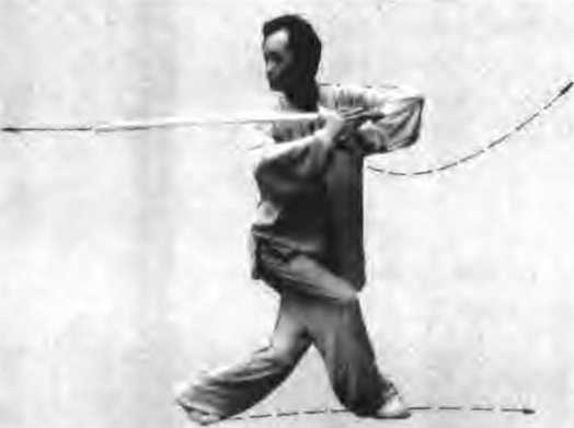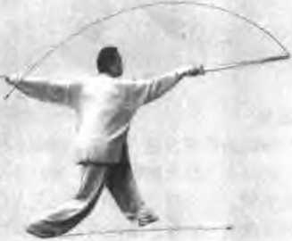 动作左脚向前说东方进一大步屈膝半蹲,腿伸直成为左弓步同时右手持剑腕稍外旋,尹心朝外从胸前向后正西方伸直平剌,左于剑指同时向前正东方直指伸出心朝外两臂与剑成直线眼视剑尖前方如图8