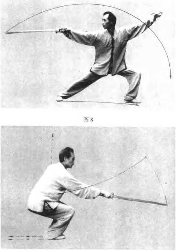 动作右脚向前上一步和左脚并步的腿屈膝全蹲,身体随左转朝东同时右手持剑腕外旋,屈时由后向匕向前弧形绕行,然后向前11余方直臂卜除悔指侧朝4剑指随屈肘附于右前臂里帆眼视剑尖如图9