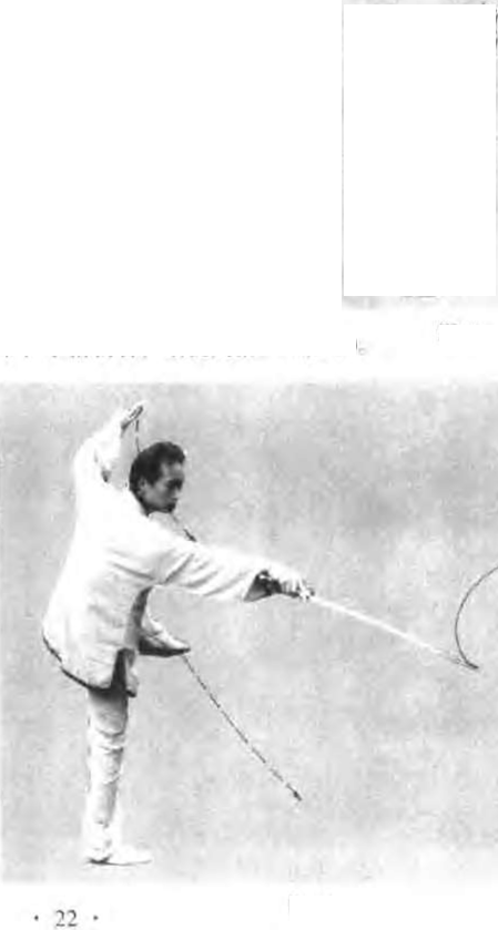 上身向左含胸侧身,左腿提膝抬起脚背绷直脚尖朝下右腿伸直独立上身随向前方探身同时分手特剑从右腰侧向左前下东北方伸直截剑尖左斜,手心朝下拇指一侧朝卜,左手剑指随由上向下、向后,向上弧出绕行届时横架于头部左后1方,,心朝捌指侧朝卜,手指朝有眼视剑尖如图