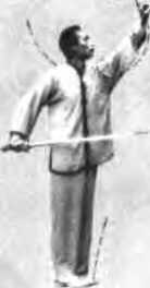 动作承势,。脚向前摆出与膝中耽。腿随之卜蹲脚跟掀起两胭之乂上身随之4转朝南同时4跟特