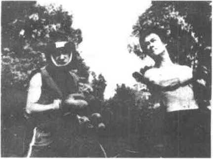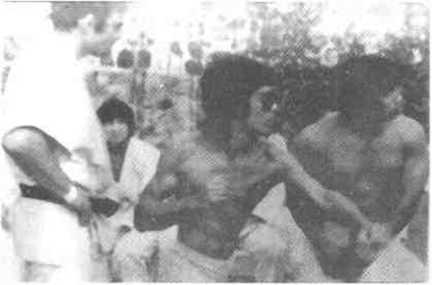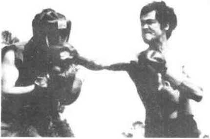 在具体训练中要求借用手靶来磨炼这-拳法上的打击力度(图155)。图156则为李小龙的嫡传高足之-拉马尔戴维斯()所示范的记强猛有力的翻背拳法。当然最具说服力的示范还是李小龙在龙争虎斗中击倒奥哈拉时的镜头(图157、图158)