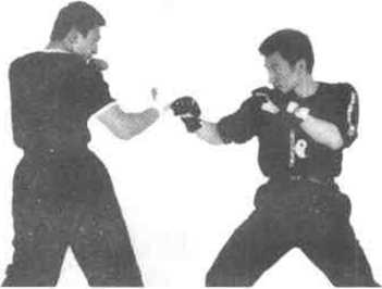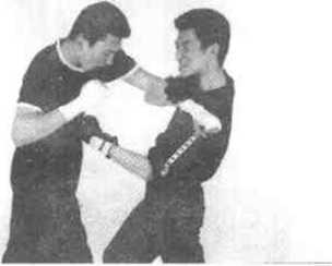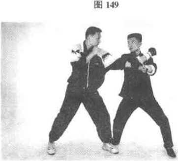 练习时由戒备式开始(图150)李小龙一般都要求我们应先抓住对手的一只手臂以便牢牢控制住对禾(图151),然后可在左手用力回拉的同时将右拳重重打出(图152),目标是对手的头部侧面或面部要害处