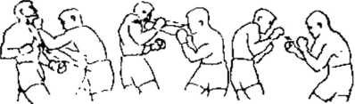 练习时由戒备式开始(图145),通常情况下都是先避开对手的攻击(图146),然后迎着对手的攻势而将左(右)拳狠狠打击(图147)。也可在前手直拳或前手勾拳的佯攻下突发左上击拳去重击对手(图148),这是李小龙手绘的一组组合攻击法主要用于贴近去重创对手