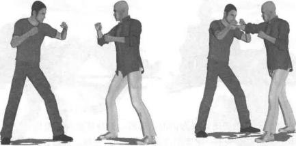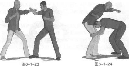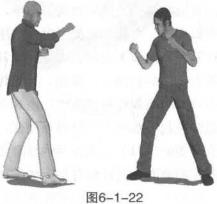 动作说明实战中双方对峙(图6-1-22)。对手左脚快速向前上步突然用左直拳击打我上盘我迅速屈右臂以右小臂外侧为力点自内向外用力格挡对手左小臂内侧以化解其攻势(图6-1-23)紧接着我身体突然
