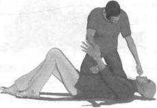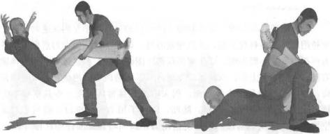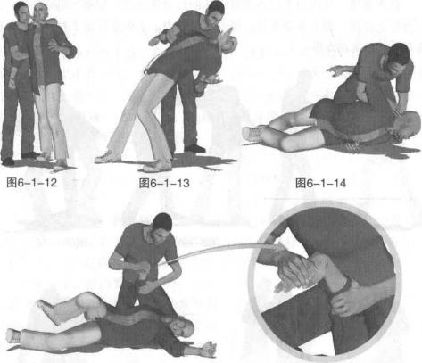 右转左脚向前上步双腿屈膝下蹲双手随势向下搂抱住对手双腿膝窝部位同时重心前移上体下俯用头部向前猛顶其腹部令其重心失去平衡上体后仰(图6-1-24)随即我双手用力向回提拉将对手双腿悬空提起配合头部前顶上下交错用力瞬间将其仰面摔倒在地(图6-1-25)上动不停我身体迅速左转左手臂用力翻拧对手右小腿右手臂同时翻折其左小腿使对手在仰摔着地的瞬间将身体翻转过来变成脸面朝下、趴俯在地姿势我身体随之继续左后转右脚抬起由其身体上方跨过双腿屈膝下蹲重心下沉以臀部为力点向后猛坐对手后腰部双手配合用力搬折其双腿以达到彻底控制对手的目的(6-1-26)-