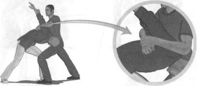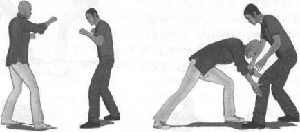 动作说明实战中双方交手(图3-4-12)对手突然左脚上步蹿进俯身伸出双手向我扑来欲抓抱我双腿将我掀倒(图3-4-13)此时我左脚迅速向前迈进半步同时双手自下而上、由对手双臂内侧向外穿过其两腋窝至其脑后屈肘用左手抓住右手腕部