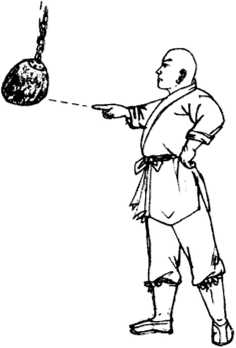 初练时悬一铁锤于常经过之要道出入必见见必以一指击之每日如此。初时指着锤而锤不动其后渐能推动然后渐渐向后移步至能指不若锤凭空一指锤亦动摇。至此一指禅功第一步功夫已成就矣。
