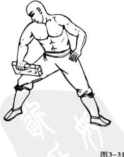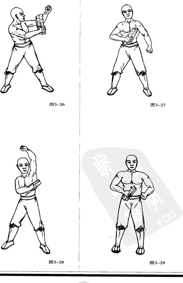一年之后更换窑砖亦依前述次序排练更过半年则易金破金砖者以铜铁铸成之痔,非真金也亦练半年则功成。全身各部之肌肉即坚实异常,纵不能与刀枪不入之铁牛功等媲美然月拳脚踢打,亦不至于受伤矣。