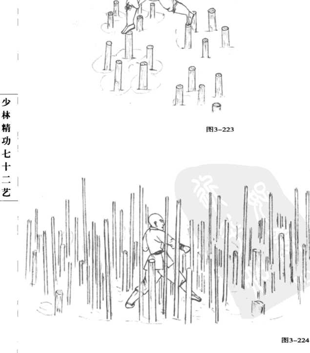 眼法之外又须练步法、身法。步法之练习三才桩、七星桩、九星桩、梅花桃等适用至身法习之甚难。先择一广场钉立高低不一、大小不等之竹竿、木桃等阻碍物所钉之地位务须参差不齐如犬牙之相错切忌次序井然而有规则。地面之上又每隔少许而布石灰一摊亦不得有次序。但所钉之桩中间距离至多一尺练者即侧身于其间急走身不得与桩相触足不得踏着石灰。走时又须东旋西转不准有一定之途径如蝴蝶穿花,青蛇入草。在起初之时,万难如原行步亦迟缓其后愈走愈疾纵迂回曲折亦无不可。然后更于桩上置锋利之刃竹竿横架钩刺之隔下面则间布铁英藜及绊脚索等物更以前法练之至能出入自如,则功已大成。可命数十人持武器围攻,空手出入其中亦不至有所伤损。(图3-221?224)