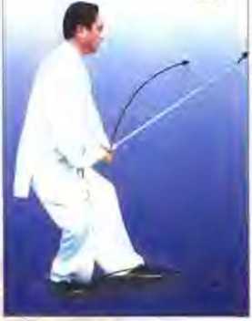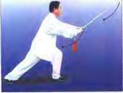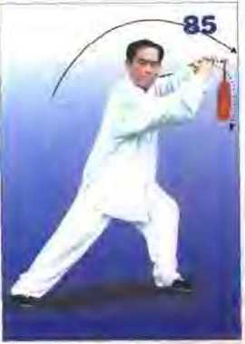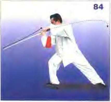 2重心继续左移腰身继续左转身形路前俯。随转腰弓左腿、伸右腿右脚尖随之内扣约135度成左侧弓步式。同时右手持剑将剑柄经右肩旁带至右肩前手心朝平剑、剑尖朝后(西)左手仍合于右手背形成背剑式眼顾及剑柄右视。(图85)