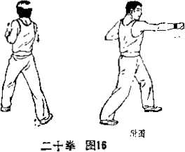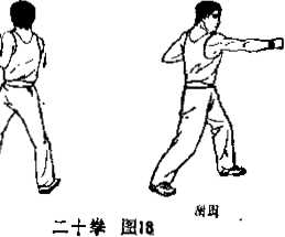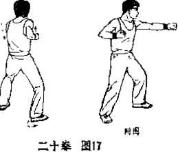 上动不停右脚踉内卷膝略屈左脚不动成左不丁不八步重心微后将身躯右转成右半掩身。同时左拳伸肘直臂内旋并向前偏内撞出止于身前正中位高齐胸拳眼向内拳面朝前右拳外旋转为仰拳屈肘后拉收于右侧胸旁匚眼视前方短促呼气。(图17)一0,左弓箭步右钻撞拳与第八动相同。(图18)