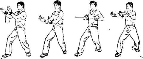 ① 左脚跟略外摆,身躯右转成右半掩身同时双掌四指屈曲成姜母掌并屈肘后拉收于两侧胸旁掌心向前屈指侧朝上。(图51)② 左脚跟略内收前蹬身躯左转仍向东南成墓牌身同时双掌伸肘直臂向前挡出掌高平肩掌心向前屈指侧朝上眼视前方。〈图52)乱头拳图11沉头卷012近头拳图1沉来攀醐瞄