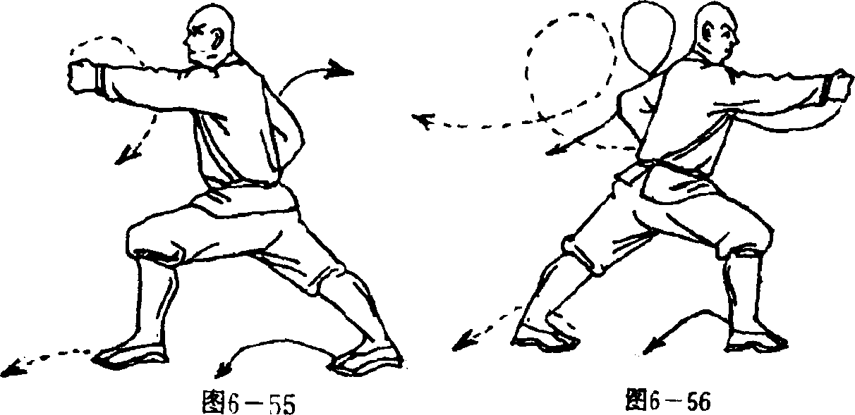 两腿成右弓步同时右拳环弧向前崩击拳心向左拳眼向上左臂屈肘左拳收护于右腰侧拳心向内拳眼向上。目视前方(图6—56)