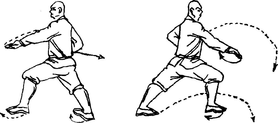 右脚为轴体左转90°,左脚在前方一步下落两踉成