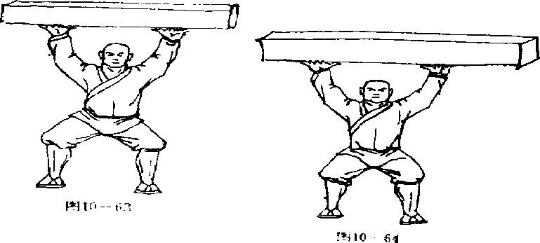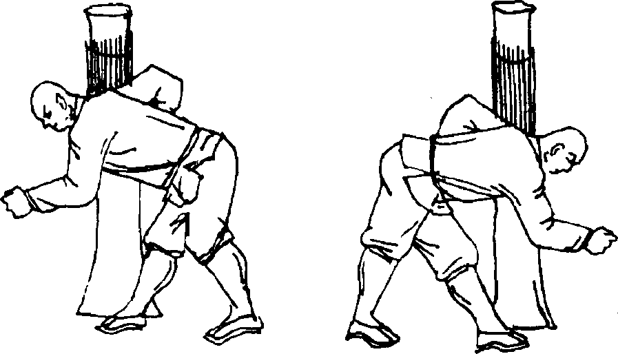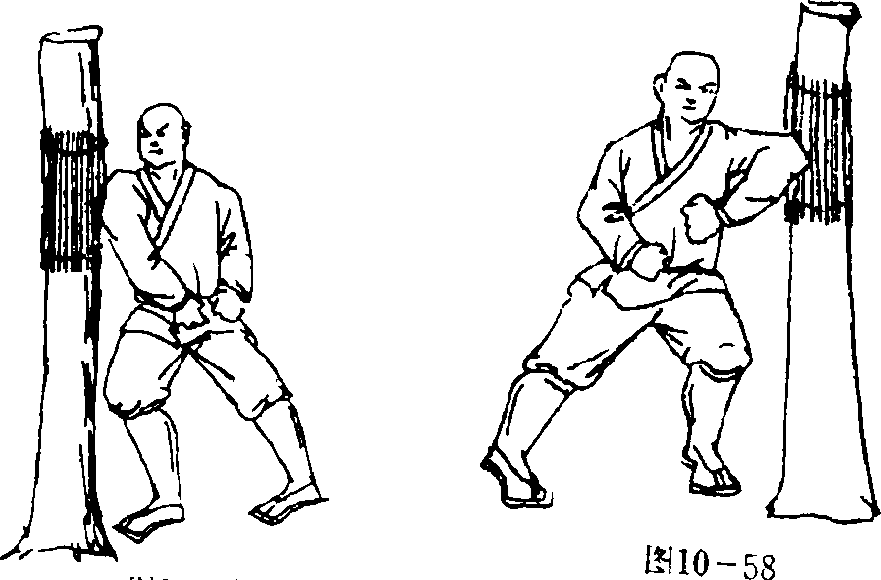 3,探身向前以肩部拱撞木桩每次两肩交替练习木桩100—300下最多可达600下(图10—59、60)