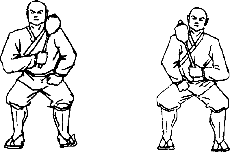 初练此功时先空手练习。两脚马步两手上举头顶,