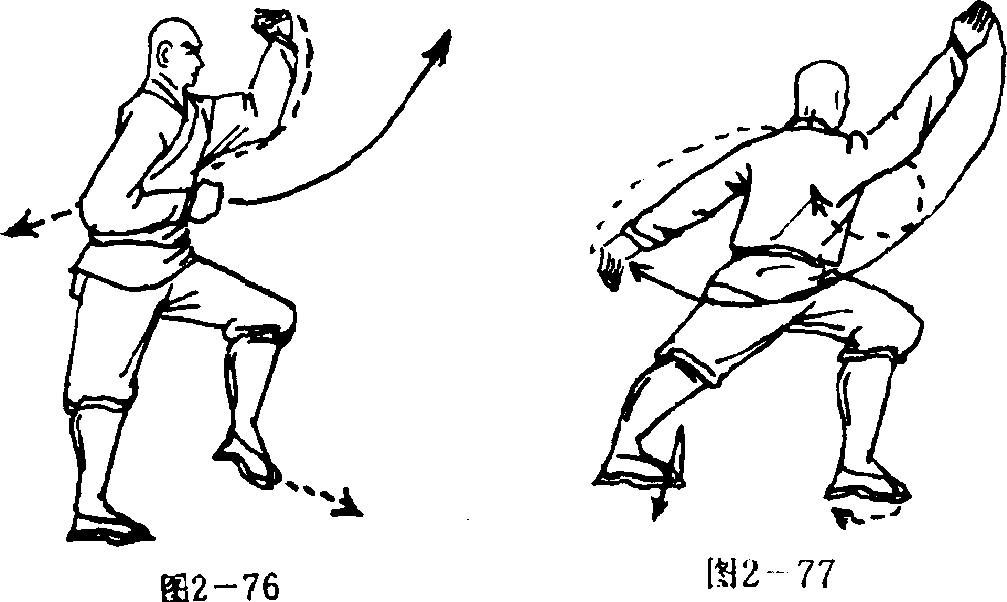 成独立步,同时左臂屈肘左拳上挑于头上左前方拳心向内拳眼向外右臂屈肘右拳护于右肋前侧拳心向内奉眼向上目视前方(图2—76)。