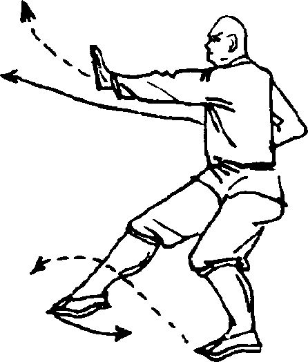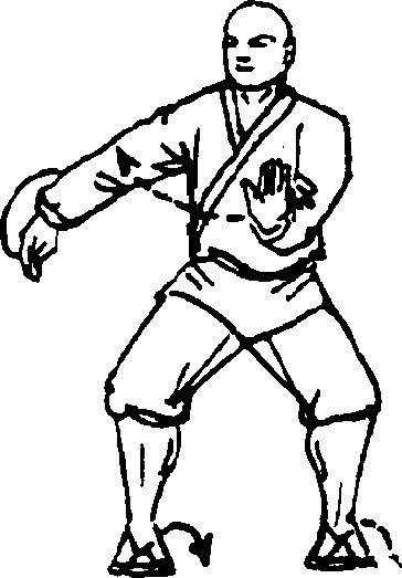 实战应用,敌背后追来我急转身一足踏住敌足使敌难以脱逃同时以反掌崩击敌小腹或裆部敌即受伤败阵