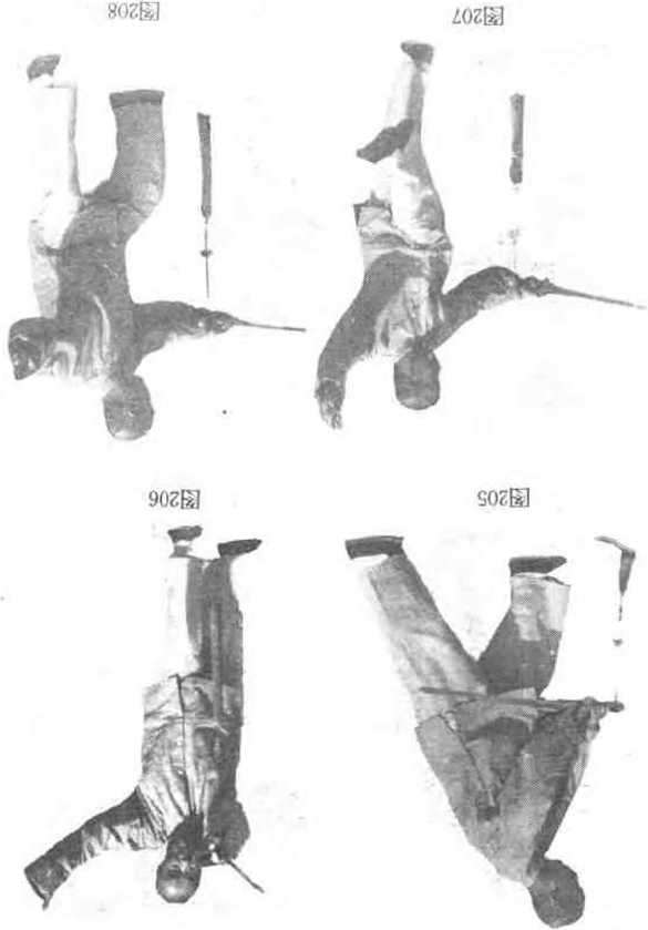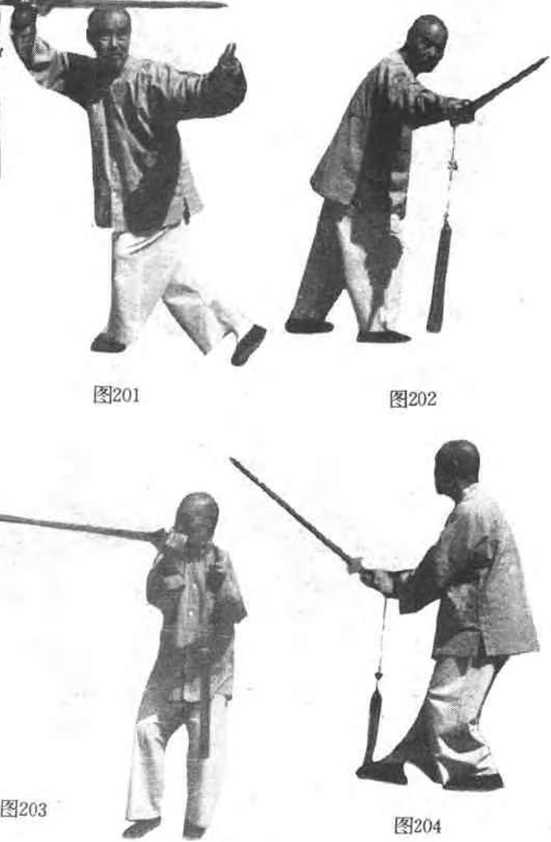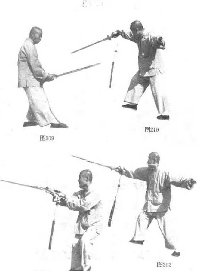 作者于六十年代初期与杨禹廷老师在北京市中山公国十字亭教授太极拳时,曾为杨老师拍摄太极剑照片一套口该套剑照是作者亲手拍摄的为作者所仅有口珍藏多年十分宝贵此次选出其中12张献与读者。其姿式名称如下分剑七星(图23)、翻身劈剑(图202)、卧虎当门(图203)、劈山夺剑(图204)、翻身连环挂(图205)、迎门剑(图206)、反手式(图207)、左右反身劈剑(图208人拨草寻蛇(图209)乌龙摆尾(图210)、鸽子串林(图211)、农夫着锄(图212)。图21