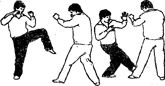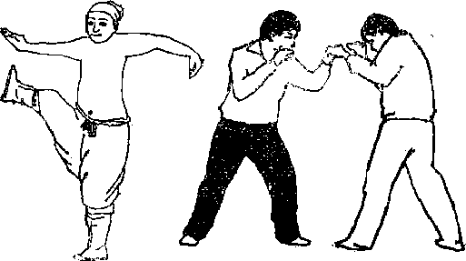 (1)二人相峙而立当敌死守不攻时我则以前手诱击敌面(图1—32)或以前脚虚踢其裆(图1一33)