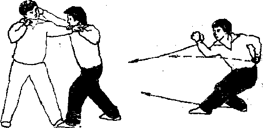 (2)上动不停重心前移成左弓步产右手握拳由右暧恻向前贯击敌左耳侧左手随击打之势向左侧牵拉(图2—25)。