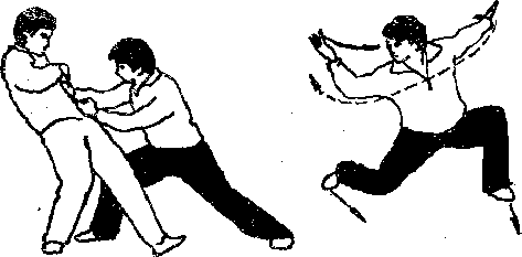 用法我双捕敌腹敌如奋力抵抗,我则不与其纠缠,应顺势闪让以手撩其左腿使其跌倒(附维2—17)