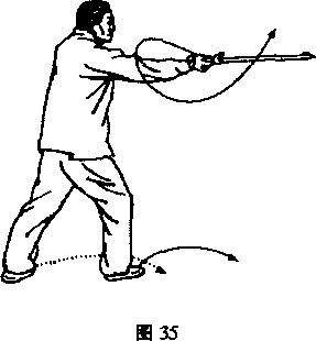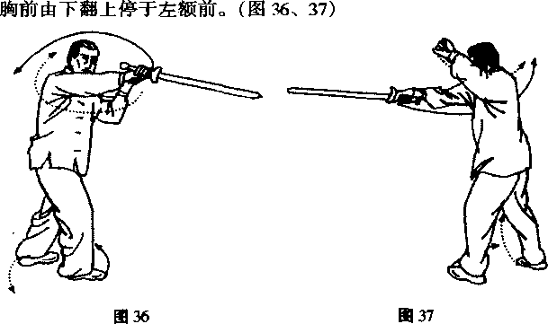 同时上身略后仰(给剑让剑圈口终了势阳手剑把,(图35)同时上身略后仰(给剑让剑圈口终了势阳手剑把,(图35)