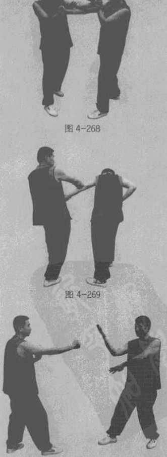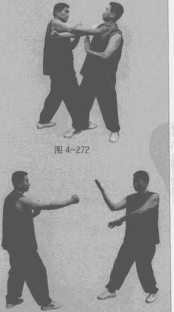 突然上右步逼住乙方右脚后跟同时左手按住乙方右手关节位右手扣住乙方的脖子同时发劲将乙方摔个四脚朝天(图4-272)