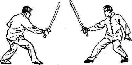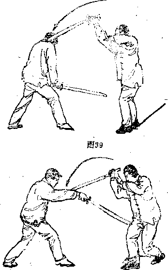 1乙方前后两腿依次向前方进步同时直剌甲方的诩部(图?)当乙方剌来时甲方向右侧闪步身体左转同时将兵器带至面