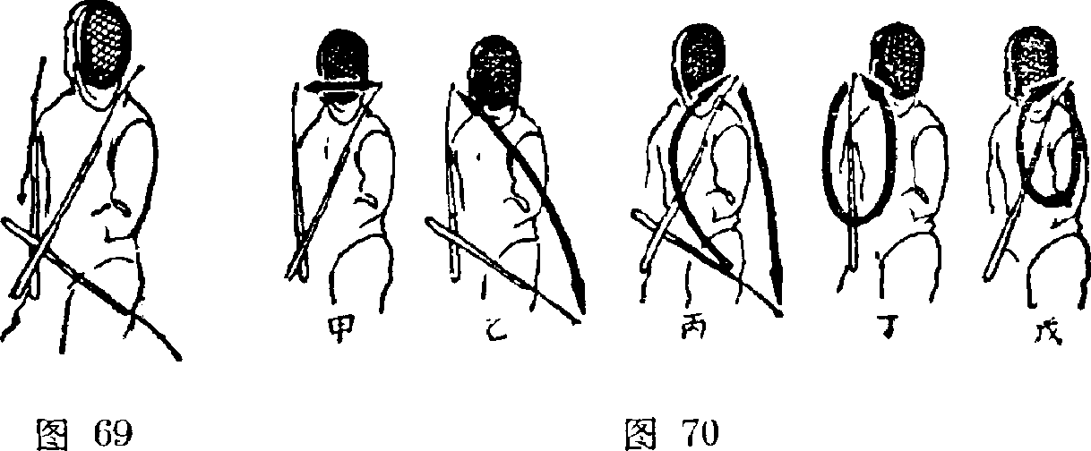 70 在格挡时刺刀(刀尖的路畿)的移动甲是直接格挡乙、丙是半环格挡丁、戊是环格挡(图70)