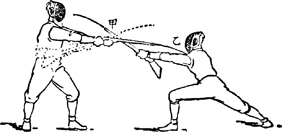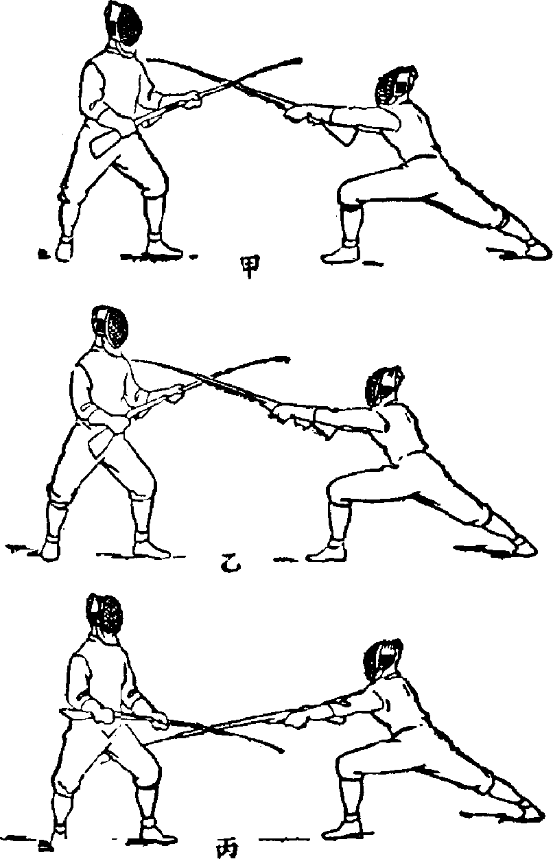 刻跟着用刺还击用刺的还击动作和进攻是一样还击刺的动作可以用直刺(是最快的还击)和用樽移剌。根据距离可不用箭步还击或用箭步还击。图72是向左格挡还击甲是格挡乙是还击。还击刺乃是一种反攻例如在击退还击之后做还击刺。