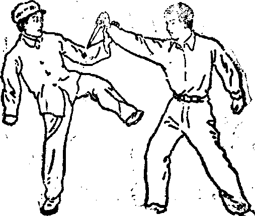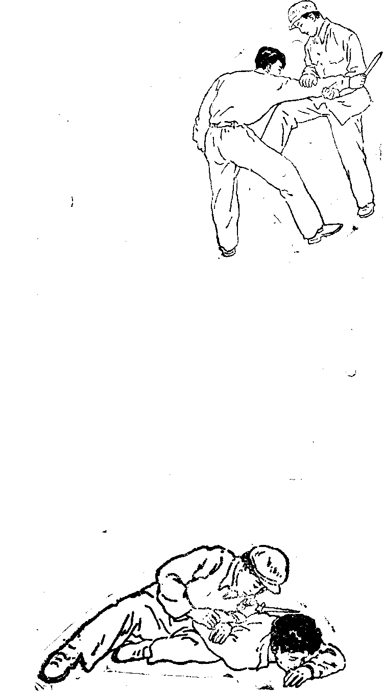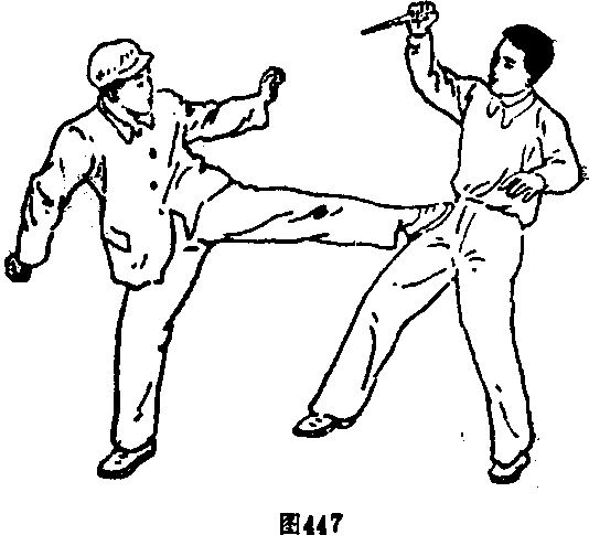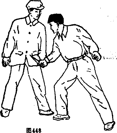 动作当敌右手持刀晌我上刺时我迅速后(左)闪身左手向右拨敌右小臂同时用左脚侧蹬敌肋或跨(如图446、447)要点闪身,拨和侧蹬要迅速协调。二)防下剌1、切击别臂夺刀下刺(如图448)防下刺当敌右手持刀向我下刺时左脚稍向右前将并将身左手挡插敌小臂(手腕)同时右手抓拉敌右肘右脚踢裆后(如图449),立即后撤两手向右下旋转用刀将敌压倒卷腕夺刀将敌制死(如图450、451)国45。国45。图451图451要点闪身挡插抓拉踢裆同时进行大小骨夹住敌小臂下压国45。国45。图451图451