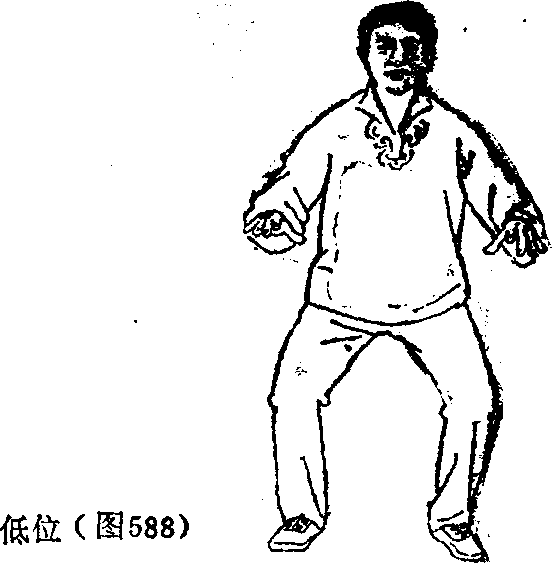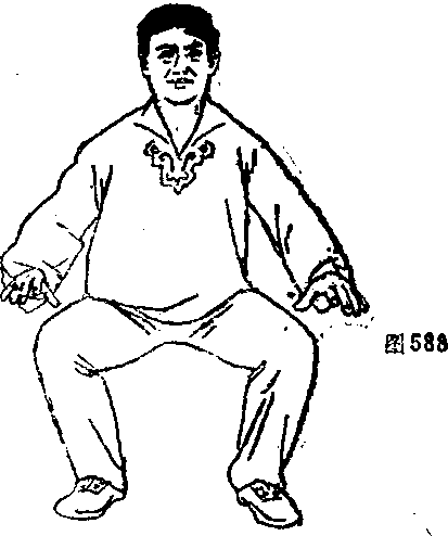 (2)飞龙平伸,在(1)的基础上头、颈、胸、腹不动两手水平前伸掌心向下五指密着放松微垂成半酶在两手前伸的同时两腿微蹲膝关节夹角120。左右(图590)。