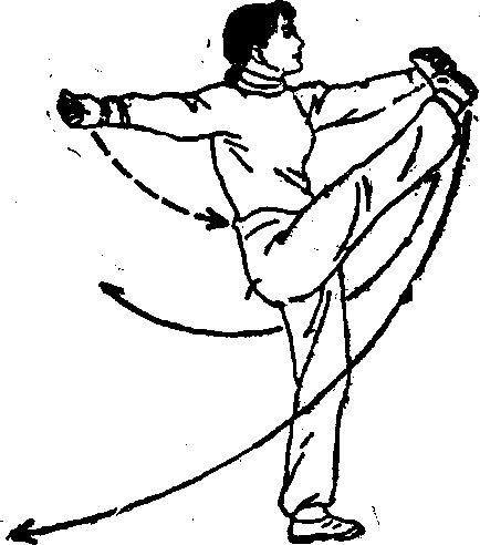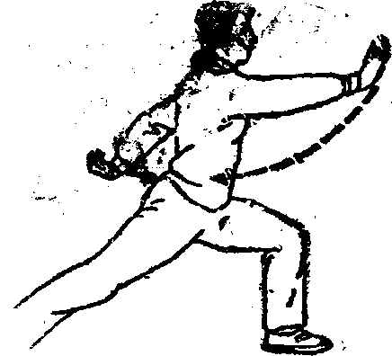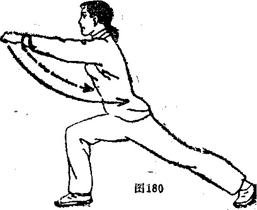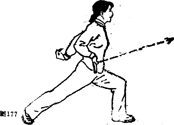 二紧接前动右脚从前向句身后落步,右腿伸直,左腮屈膝半蹲成左弓箭步同时左掌以前直臂南下,经左腿外侧向后弧形绕环摆动在身后五指撮拢成勾手反背斜下举勾尖朝上右掌则用肘收抱于右腰侧掌指朝下掌心朝前(如图177