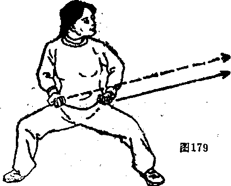 (1)右勾手和右掌同时变拳屈肘收抱于两侧拳心均朝上身躯随之右转两腿屈膝半蹲成马步,眼向右侧前方注视(如图179)