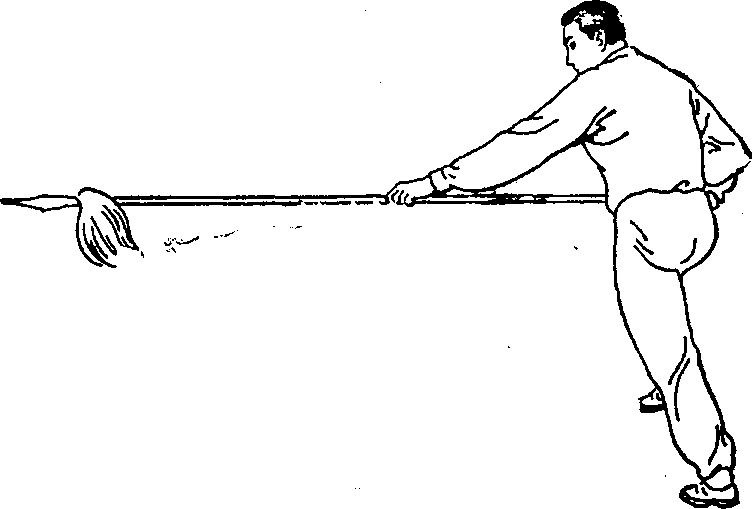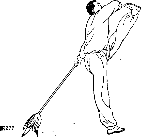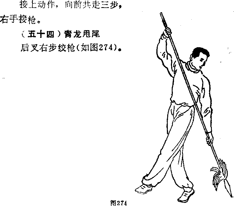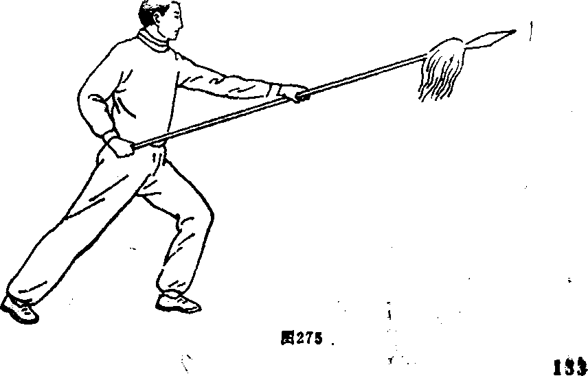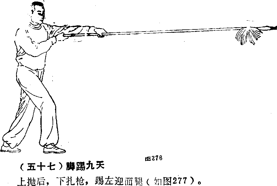 进左脚弓步拿枪(如图275)接上动作右手向前扎枪。(五十六)太公的鱼右转上两步抢点枪(如图276)。(五十八)老叟摇琴左右转身绕两步弓步扣抢(如图278) 7