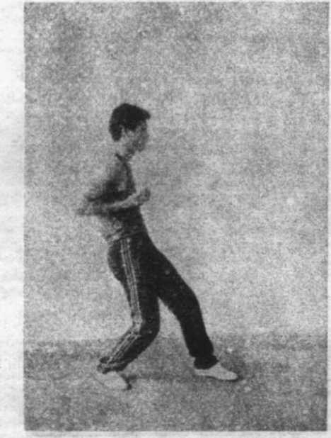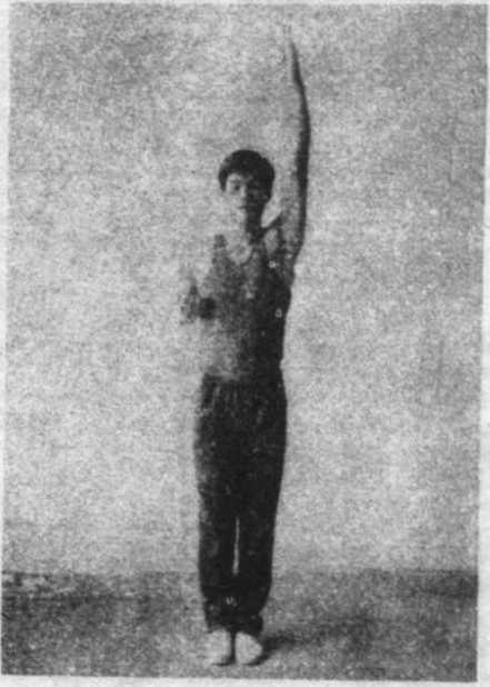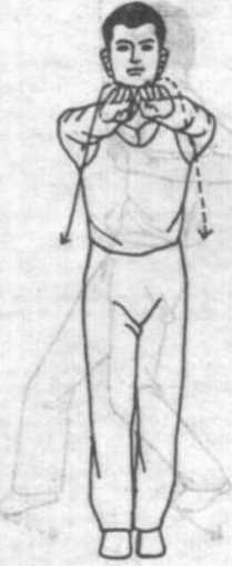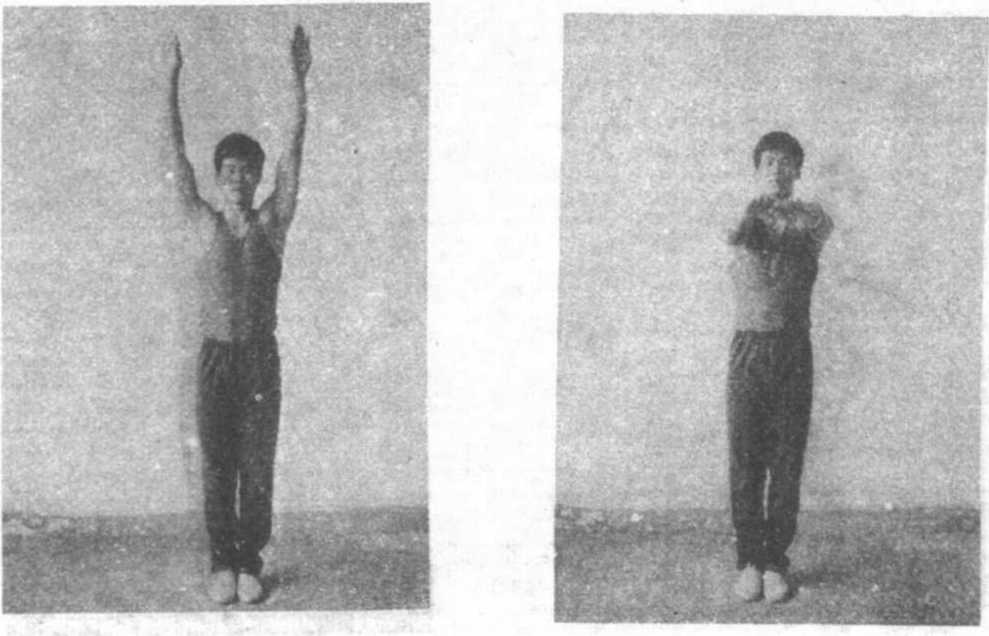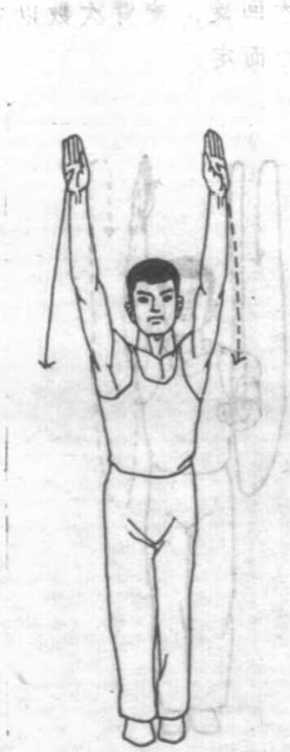 5由钳羊马势向左转体90°前虚后实宣心落在右腿上要点先向左转后向右转然后左、右转体交售进行6立正两手抱拳左拳变掌,左臂向下垂直左臂以肩为轴,由前经上向后作大回旋旋臂次数以本人所承受的能力而定7以肩为轴两臂伸直由前经上向后作大回旋8两臂放松由前向后大回旋一周然后两臂向前平举同时两臂向前伸出、送肩掌心向下两拇指相拿臂与肩平要点主要锻炼两肩的柔软性和灵活性