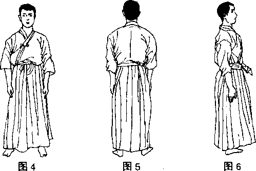 衣、裙穿着完毕以后还要用手将腰身周围的衣服扯平,然后再将裙子前后片的皱折部分拉扯平整。衣、裙穿毕的样子如(图4,正面)、(图5,背面)、(图6,侧面)。