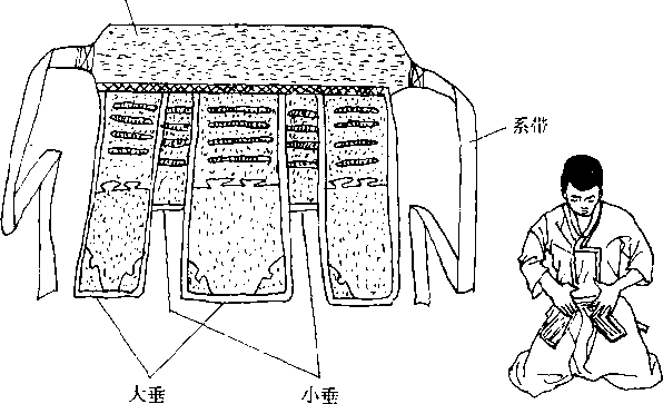 垂是用来保护腹部的一种由多层帆布缝制而成的护具。它由垂带和左、右两根系扎带子以及下方的三块大垂和两块小垂组成(图7)。