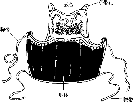 胴甲(图9)的各部名称及作用云型保护胸部胴体、保护肋骨、胃三角区左右胸带和左右腰带为系扎胴甲用。
